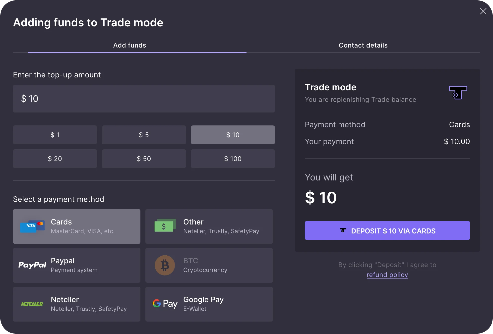 - Click on your balance at the top of the page near your profile picture. You can choose the necessary amount in the window that opens or enter it yourself in the input field below (from $1 to $5,000). Keep in mind that all amounts are given in United States Dollars (USD). After selecting the amount, click on choose the payment method.