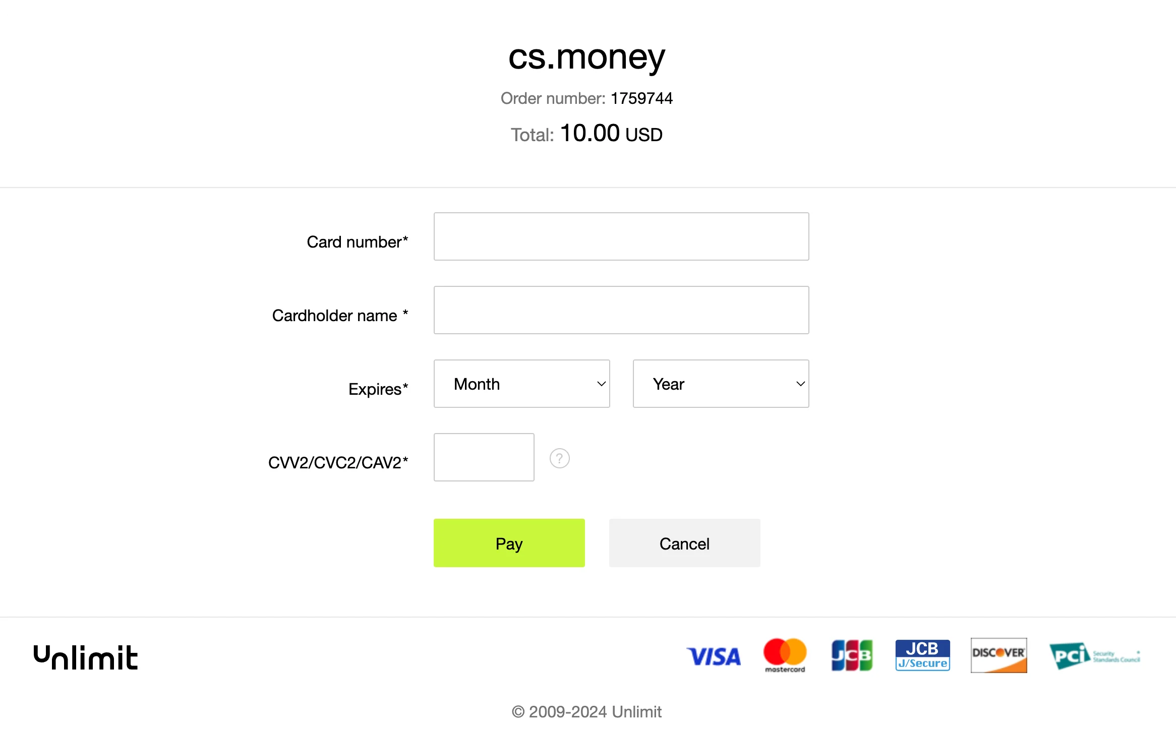 On the payment page, you will need to enter your card details. The payment system will contact your bank and transfer money to your CS.MONEY balance. A PSI DDS certificate guarantees secure work of the payment system.