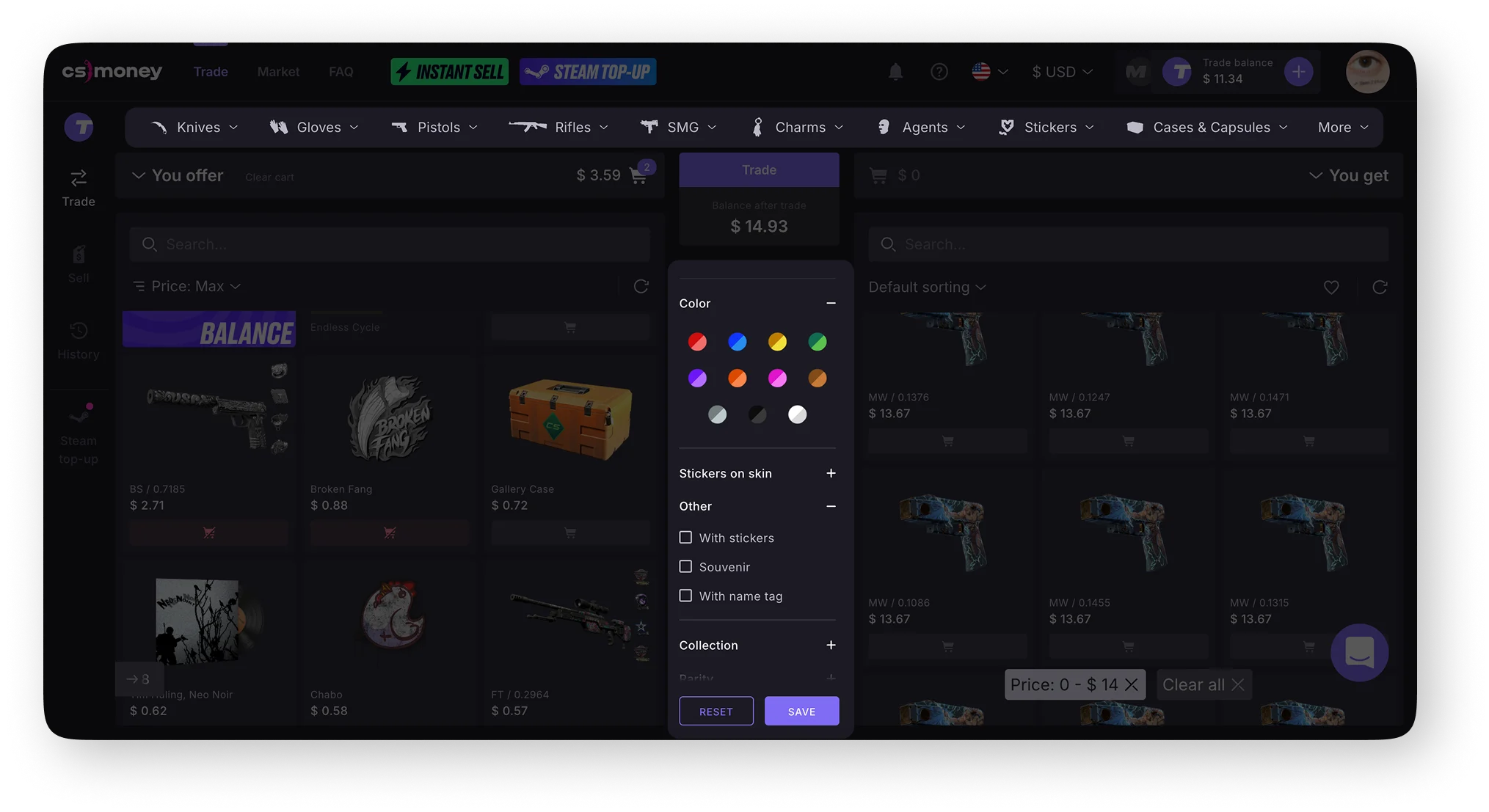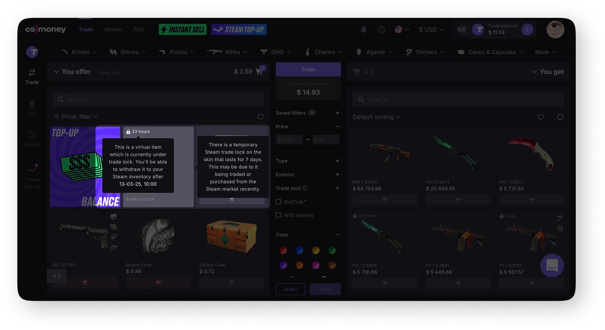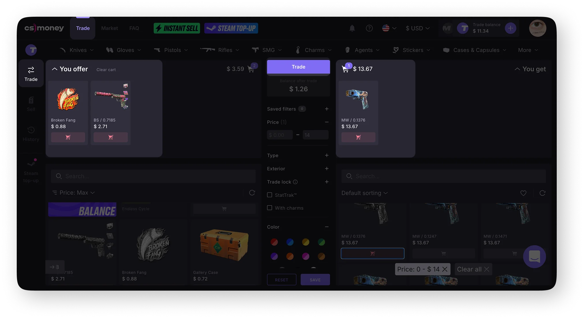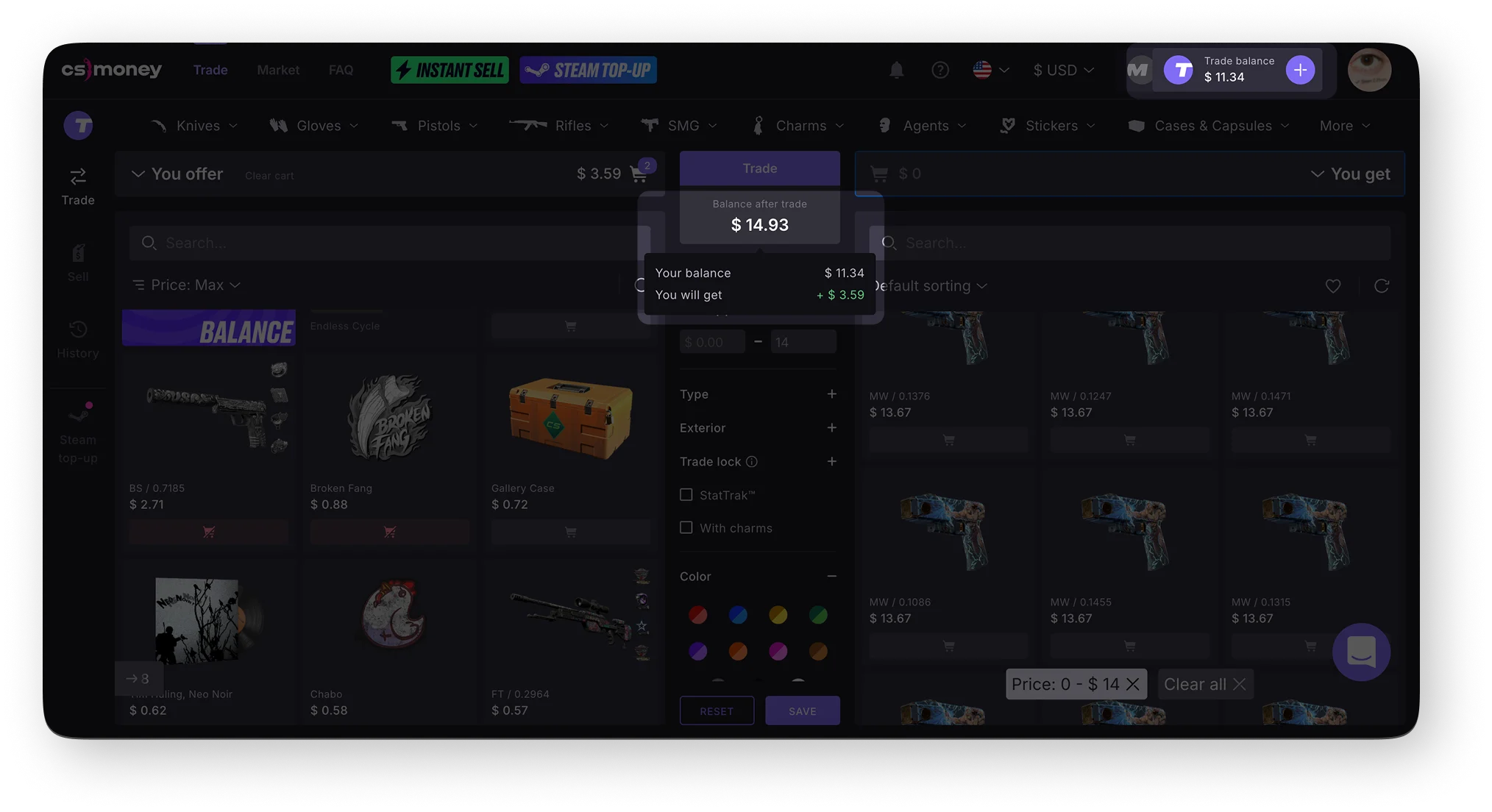 You can use the balance in the “Trade” mode to buy items or to compensate for the difference in value when trading skins. For example, if you trade an expensive item for several cheaper ones, the difference will be credited to your balance. And the opposite — if you want to trade your items for a more expensive one, the difference will be deducted from your balance.