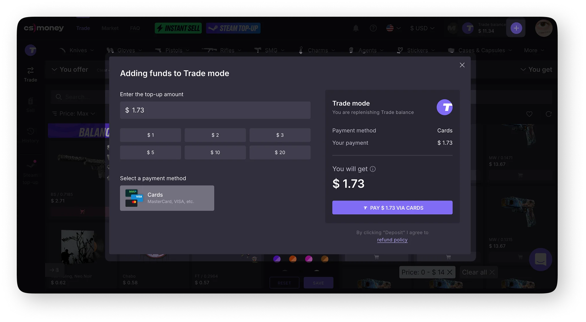 You can replenish your balance in the “Trade” mode in two ways: by trading items to your balance or by direct replenishment through a payment method convenient for you.