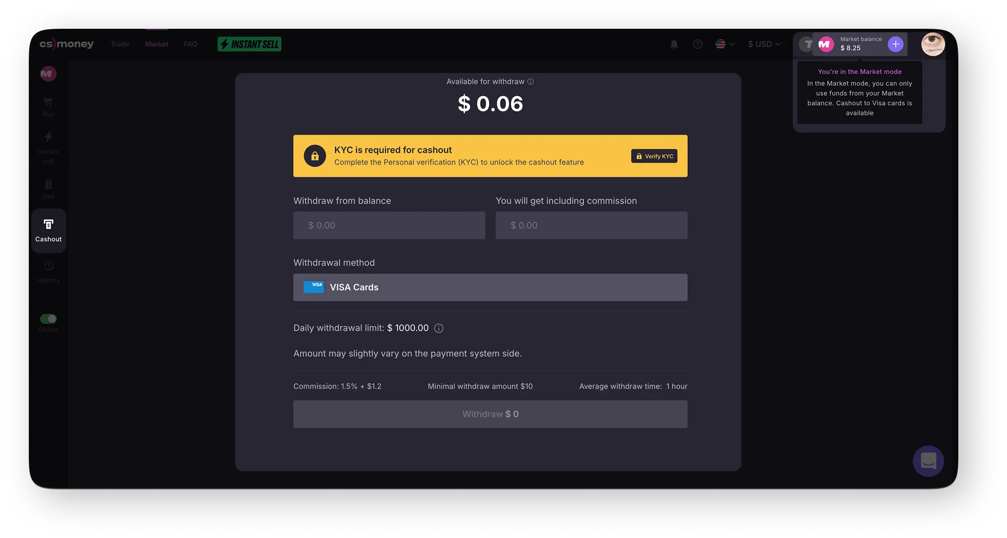 Please note: CS.MONEY has two separate balances - for the “Trade” mode and for the “Market” mode. They do not interact with each other.