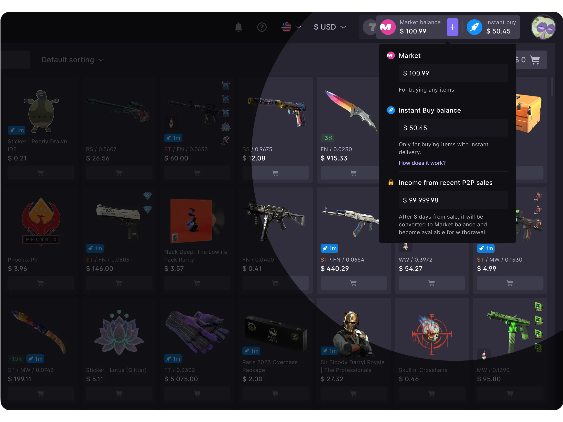 There are several types of balances on the Market. They depend on where the funds came from and define how and when they can be used. Instant buy balance comes from an Instant Sale. You can spend it right away on items with Instant Delivery, but withdraw it only after 8 days. Funds from a regular P2P sale on the Market can be spent and withdrawn only after 8 days.