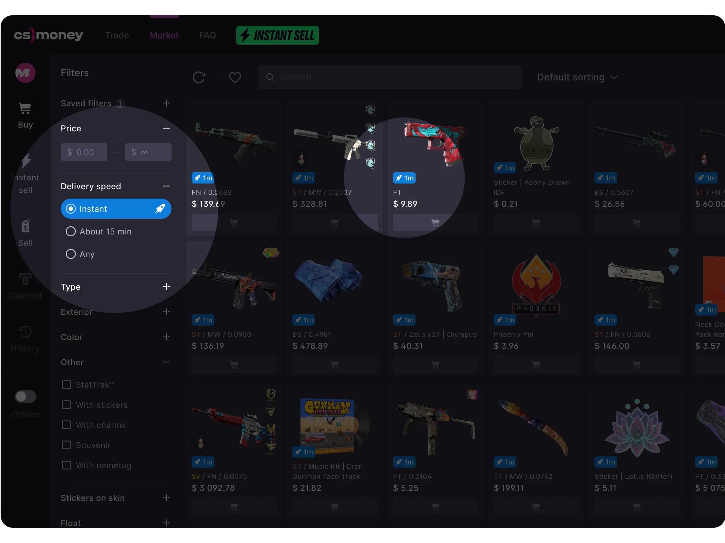 Market is a mode on CS.MONEY where you can sell and buy items from other users, as well as make Instant sales and purchases. Using Steam Session Cookies, we create the trade offer between the seller and the buyer and monitor the skin delivering process.